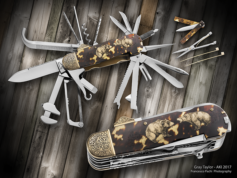 A five-inch multi-bladed sports knife. On the bottom there is a master spear blade, a fine bow saw with file worked bow and a blued hack saw blade, a screwdriver, an adjustable wrench, a short file, a buttonhook, a fish0scaler blade wth a hook remover, a fleam, a long spey blade, a sail needle, a fancy can opener, and a three-square leather borer. On the top is a horse-hoof pick blade, and a manicure blade. On the bottom end are slide out tools, including tweezers a lancet, a pick and scissors. All blade steel is CPM-154. The bolster, liners, and pins are 14K gold. The scales are exotic antique material backed with 14K gold sheet. The inlay is 14K gold. The Grizzly bears were designed, cut out and engraved by Lisa Tomlin. The maker inlaid the Grizzly bears in the scales. The bolsters were engraved by Lisa Tomlin.